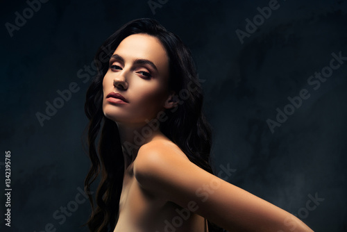 © Beauty Hero, Fototapeta premium Elegant young woman with dark hair posing against a dark background, displaying natural beauty and a stylish allure.