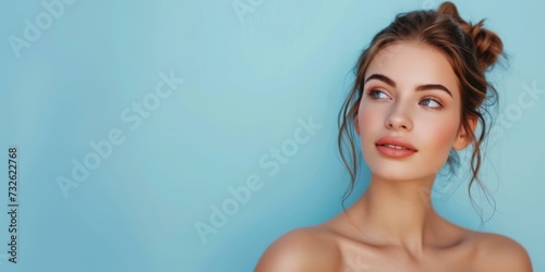 © Skyfe, Obraz premium Elegant Young Woman with Flawless Skin on Pastel Blue Background, Beauty Concept