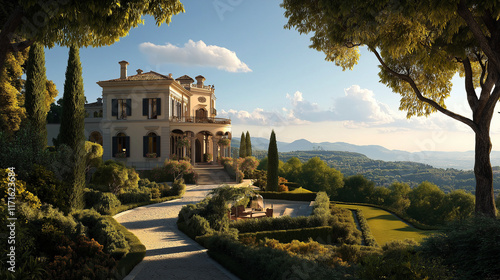 © Cedric, Obraz premium Elegante Villa mit gepflegtem Garten und atemberaubender Berglandschaft
