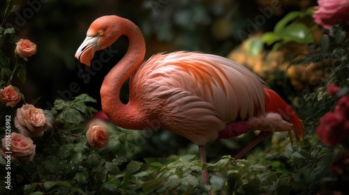 Fototapeta premium Eleganter Flamingo inmitten blühender Rosen in üppiger Gartenkulisse für...