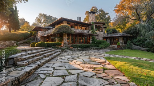 Obraz premium Elegantly designed stone house surrounded by lush greenery in a serene autumn...