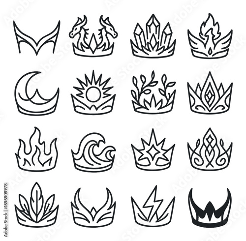 Fototapeta premium Elemental powers linear icon set. featuring crown symbols of fire, water, earth, lightning, dragon, and moon