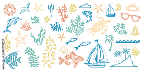 Fototapeta premium Elements of marine design, sea and summer vacation, noisy texture, isolated...