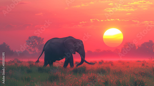 Naklejka premium elephant at sunset evening view sunset green trees grass alone animal heavy