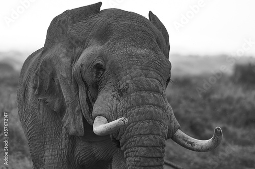 Naklejka premium Elephant Big Huge Tusker Amboseli - Big Five Safari -Baby African bush elephant Loxodonta africana Black and white
