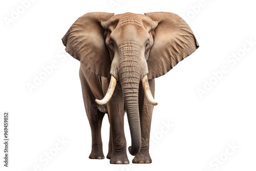 © Oratai, Obraz premium Elephant calf resting on its front legs, looking up isolated on white background