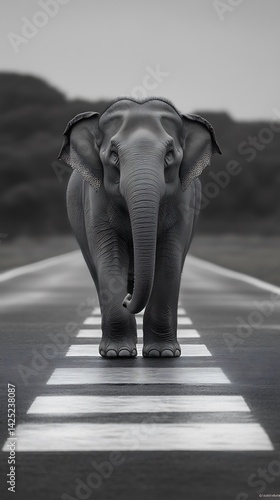 © Gun, Obraz premium Elephant Crossing Road, Gray Scale