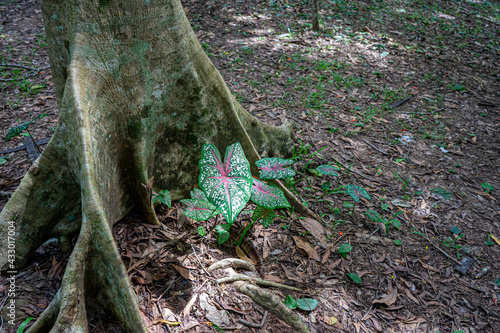 Obraz premium Elephant Ear (Caladium bicolor) grows next to a tree in a forest