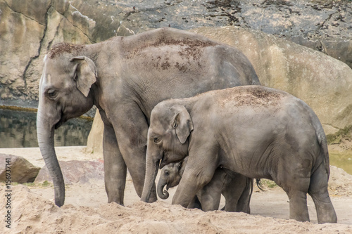 © MXW Photo, Fototapeta premium Elephant family of three grey trunk and thick skin