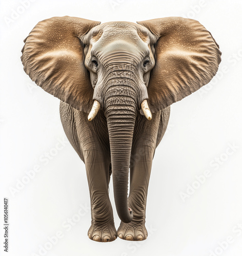 Fototapeta premium Elephant. Front view of an elephant isolated on white background, highlighting its large ears, textured skin, and tusks. Image made using Generative AI.
