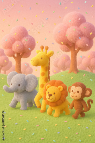 Naklejka premium Elephant, Giraffe, Lion, Monkey, pink trees, pastel colors, sprinkles falling, cheerful mood, whimsical, 3D render
