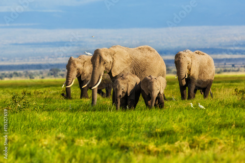 Obraz premium Elephant herd in the marsh of Amboseli National Park. Kenya