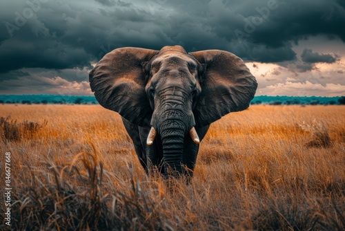 © Funk Design, Naklejka premium Elephant in the African Savannah, Majestic Closeup in Natural Habitat