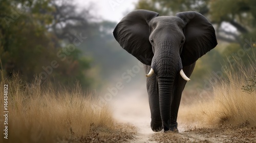 © Sarawut, Naklejka premium Elephant pausing mid-step in soft dust, natural tones and long lens depth, ambient wild setting