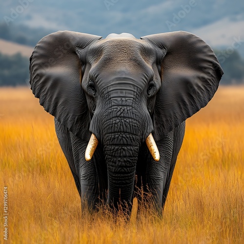 © Riko, Naklejka premium Elephant standing in field, hills behind