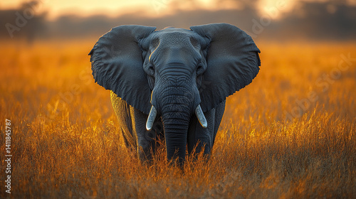 © Thanthara, Obraz premium Elephant standing in golden grass at sunset, creating majestic scene
