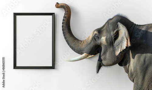 © NovaVision, Obraz premium Elephant with Trunk Touching a Blank Frame. Generative ai