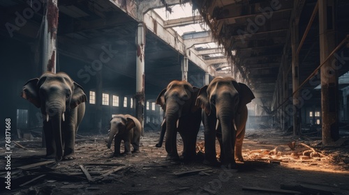 Fototapeta premium Elephants in Abandoned Buildings. Elephants in a dark.
