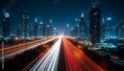 © Terapis, Fototapeta premium Elevated Night View of City Highway with Light Trails and Skyscrapers