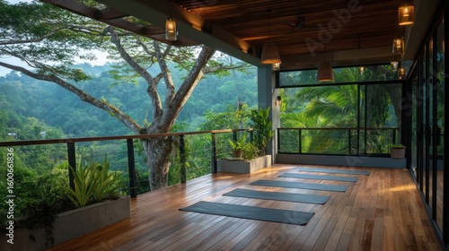 Fototapeta premium Elevated terrace yoga deck with adaptive smart lighting and speaker system, overlooking dense tropical greenery