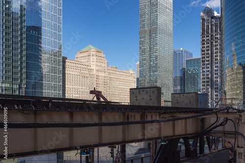 Obraz premium Elevated train tracks crossing through downtown Chicago with skyscrapers on a...
