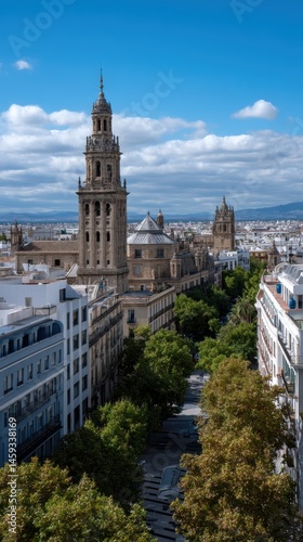 Naklejka premium Elevated view of a historic cathedral and urban architecture under a partly cloudy sky, featuring a tall tower, buildings, and trees