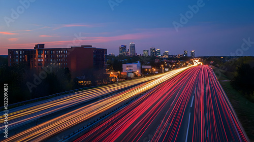 © Fadil, Fototapeta premium Elevated View Of Blurred City Traffic With Red And White Light Trails At Dusk