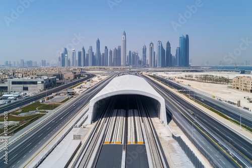© quietmind_art, Fototapeta premium Elevated view of modern highway leading into tunnel with dubai skyline in background.