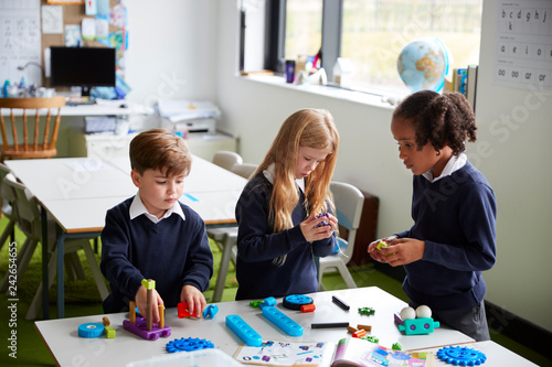 Fototapeta premium Elevated view of three primary school kids working together using construction blocks in a classroom