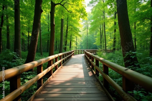 © Thitipa, Fototapeta premium Elevated walkway through forest, wooden signage, trees, serenity