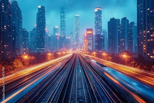 © AI04, Fototapeta premium Elevating the essence of motion and speed, an evening train ride through the city
