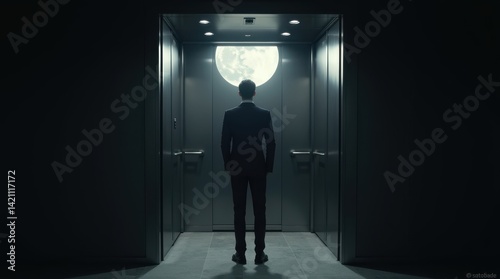 © Atralia13, Obraz premium Elevator moment business suit encounter in a modern office environment captured from behind reflecting ambition