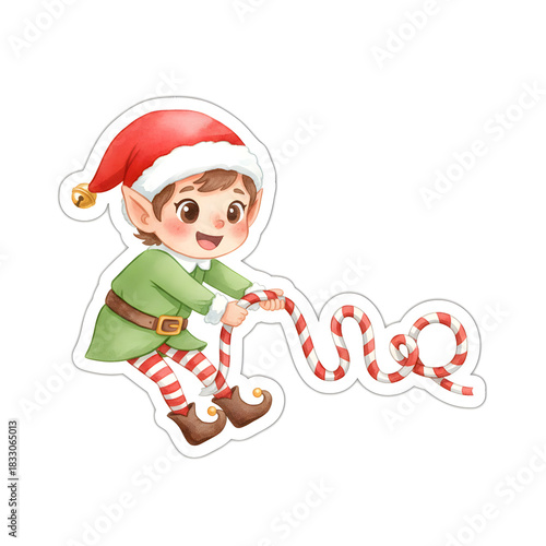 Obraz premium Elf Pulling Candy Ribbon — Holiday Watercolor Sticker