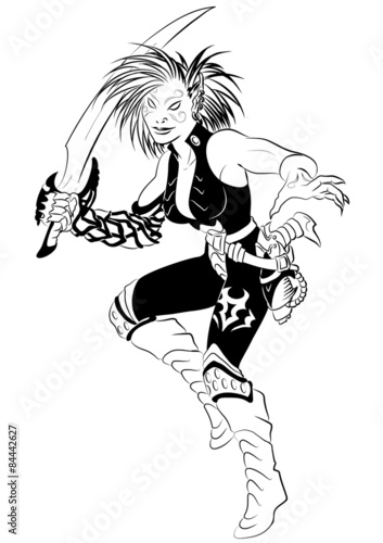 © Work On Color, Fototapeta premium Elfa guerriera abissale pesantemente armata con spada e pistola futuristica