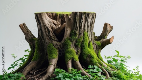 Fototapeta premium Eliminate the tree stump. Moss-covered tree roots. An ancient tree stump surrounded by vibrant greenery. Standalone dead tree set against a white backdrop. High-quality clipping mask.