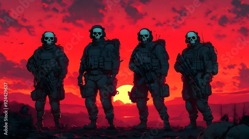 © Khukrit, Naklejka premium Elite Skull-Themed Soldiers in Tactical Gear Engage in Gritty Military Sci-Fi Action