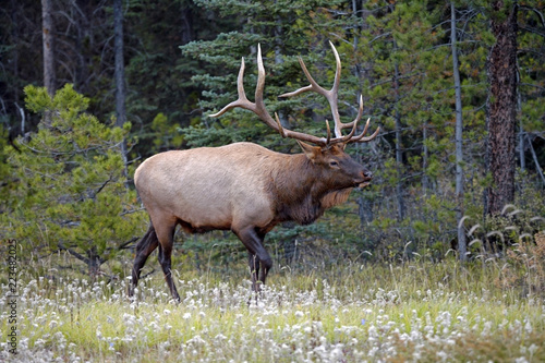 © rima15, Naklejka premium Elk Bull with large Antlers walking in meadow at edge of forest.