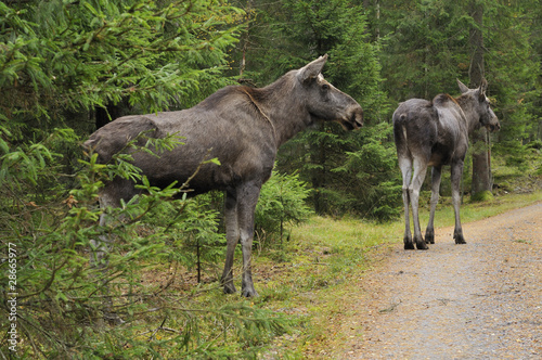 © allevad, Fototapeta premium Elk cow with calf in spruce fir forest