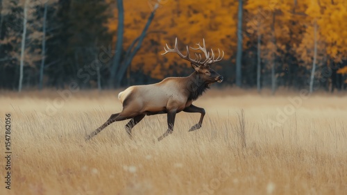 © Prostock-studio, Fototapeta premium Elk gallops gracefully across a golden meadow surrounded by vibrant autumn trees.