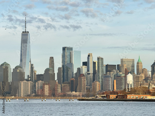 Obraz premium Ellis Island and Manhattan skyscrapers.CU. Ellis Island, where the immigration office was located in the early US, and the skyscrapers of the Lower East Side. From Liberty State Park in New Jersey.