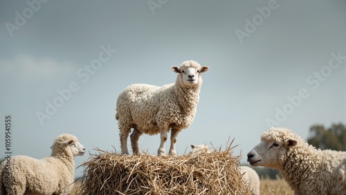 Fototapeta premium Eloquent sheep atop haystack inspiring flock below with dramatic wool