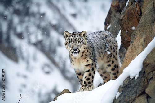 Fototapeta premium Elusive Snow Leopard in the Snow - Captured by Generative AI
