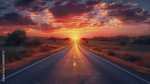 © Kanisorn, Naklejka premium Embark on a captivating odyssey of self-discovery and achievement down a boundless highway at dusk, ideal for automotive promos.