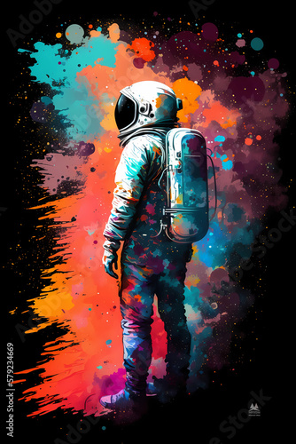 © Mohammad, Fototapeta premium Embarking on a Cosmic Adventure: Astronaut Soaring Against a Bold Color Splash Background, AI-Generated Art
