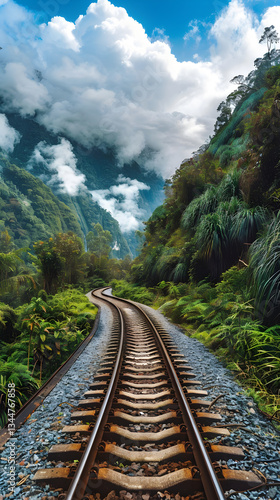 © Ethel, Fototapeta premium Embarking on a Serene Journey: A Scenic, Curving Railway Track Amidst Lush Greenery