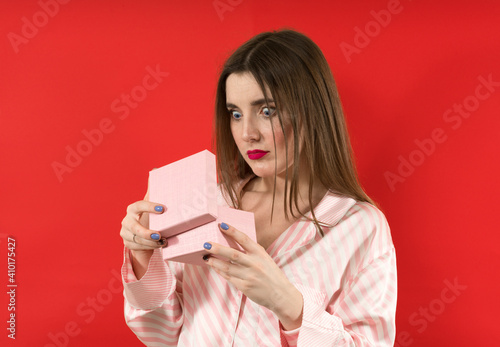 Fototapeta premium Embarrassed woman looking on a present on red background