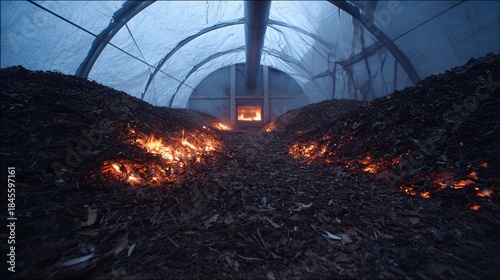 Obraz premium Ember Glow: Heaps of smoldering organic material in a covered space, fire...