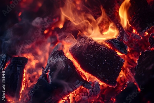 Fototapeta premium Embers glowing in fireplace, smoky night, warmth