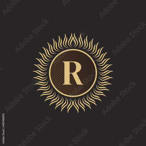 © free, Fototapeta premium Emblem Letter R Gold Monogram Design. Luxury Volumetric Logo Template. 3D Line Ornament for Business Sign, Badge, Crest, Label, Boutique Brand, Hotel, Restaurant, Heraldic. Vector Illustration