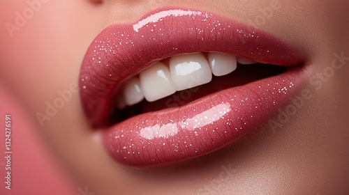 © Sang, Obraz premium Embodying beauty and femininity, a close up features beautiful plump female lips adorned with pink lipstick slightly parted to reveal white teeth against a matching pink background.